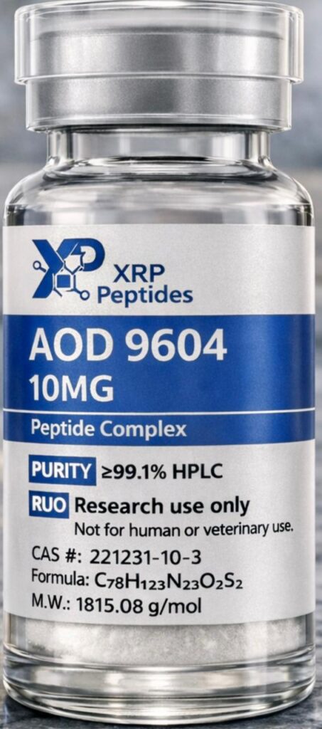 O AOD 9604 é um peptídeo sintético de 15 aminoácidos derivado da extremidade C-terminal do hormônio do crescimento humano (HGH), com tirosina substituída por fenilalanina na extremidade N-terminal. Desenvolvido para o tratamento da obesidade, ele mimetiza os efeitos de queima de gordura do HGH sem promover o crescimento muscular ou apresentar efeitos colaterais diabetogênicos. Estimula seletivamente a lipólise e inibe a lipogênese, melhora o metabolismo ósseo com potencial para o tratamento da osteoporose e oferece vantagens como a regulação direcionada do metabolismo de gordura sem afetar os níveis de açúcar no sangue/crescimento, perda de peso mais rápida do que apenas dieta e exercícios, além de ser bem tolerado em estudos pré-clínicos
