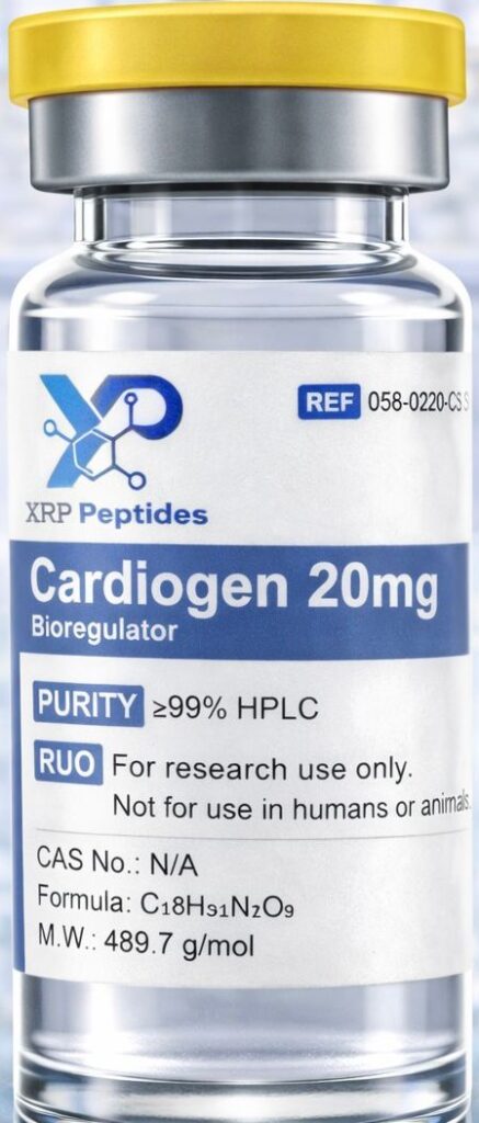 Cardiogen é um peptídeo curto que atua como biorregulador, exercendo efeitos sobre os tecidos cardiovasculares por meio de mecanismos como a regulação da expressão gênica, a proteção das células contra danos oxidativos e a modulação dos processos de hidrólise e reparo do DNA, promovendo assim a saúde cardíaca. Estudos indicam que ele atua principalmente sobre os fibroblastos, estimulando sua proliferação e promovendo a síntese e secreção de componentes da matriz extracelular, como colágeno e elastina, o que auxilia no reparo e regeneração tecidual. Pode também inibir a apoptose de cardiomiócitos e regular vias de sinalização celular, demonstrando potencial na melhora de diversas doenças cardiovasculares, incluindo remodelamento cardíaco, hipertensão, insuficiência cardíaca, angina pectoris, doença arterial coronariana, hipertrofia miocárdica, miocardite e distrofia miocárdica.