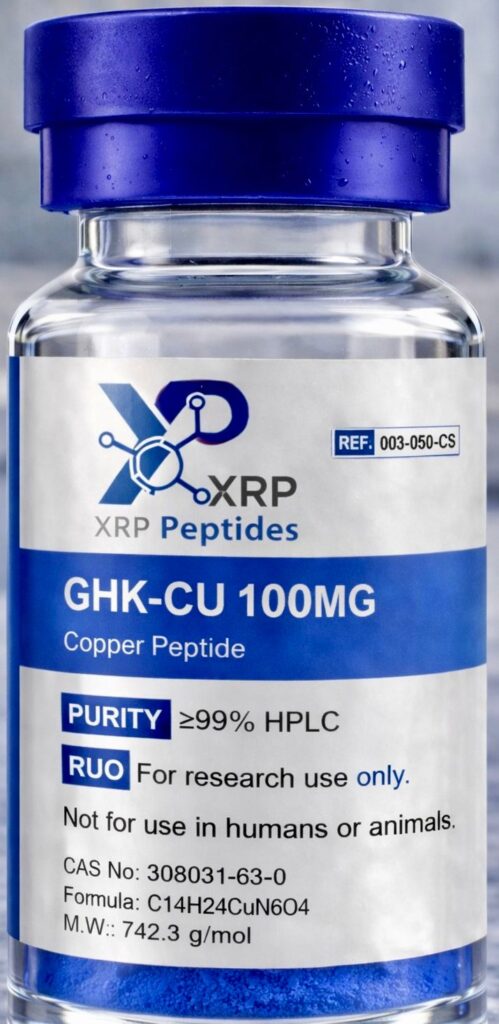 O GHK-cu é um complexo formado por um tripeptídeo e íons de cobre divalentes (Cu⊃2;⁺). Ele regula a atividade celular por meio de múltiplos mecanismos: estimulando a proliferação de fibroblastos, promovendo a síntese de colágeno, elastina e glicosaminoglicanos e modulando a remodelação da matriz extracelular. Apresenta atividade anti-inflamatória, inibindo a liberação de fatores pró-inflamatórios e reduzindo as respostas inflamatórias teciduais. Também promove a angiogênese, acelera a cicatrização de feridas e exerce efeitos antioxidantes, eliminando espécies reativas de oxigênio. O GHK-cu encontra ampla aplicação em dermatologia para melhorar a função de barreira da pele e reduzir rugas. Em pesquisas sobre cicatrização de feridas, suas propriedades de regeneração tecidual são exploradas para acelerar a recuperação de lesões cutâneas.