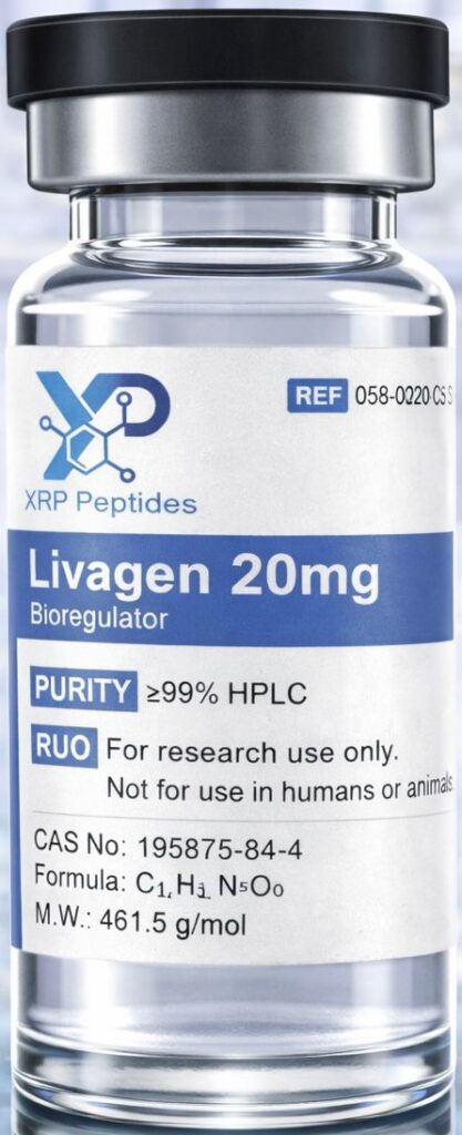 Livagen é um peptídeo curto bioregulador que atua regulando a expressão gênica e promovendo a síntese proteica. Ele pode modular a atividade de enzimas digestivas e, adicionalmente, inibir enzimas degradadoras de encefalina no soro humano. Através de seus efeitos hepatoprotetores, Livagen melhora o estado imunológico e antioxidante, promovendo a recuperação da função hepática em casos de hepatite. Também ativa a cromatina em linfócitos de idosos. Ao regular a atividade de enzimas-chave e influenciar as vias de estresse oxidativo, Livagen auxilia no retardo do envelhecimento celular. Na prevenção e no tratamento de doenças relacionadas, Livagen apresenta potencial valor de aplicação.